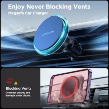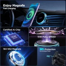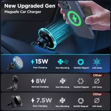 This **Magnetic Car Phone Holder** stands out for its unmatched magnetic strength and full-speed 15W wireless charging. With its heat dissipation technology and strong N52 magnets, your phone remains secure and cool during use. The one-click release feature and wide vent compatibility add to the convenience, making this an essential accessory for iPhone 12-15 series users. Plus, the sleek design and LED blue light add a modern, stylish touch to your car’s interior without blocking airflow.