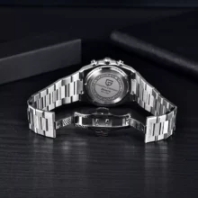 This watch boasts a sleek blue, black, and white color scheme, enhancing its luxurious appeal. The ceramic top ring on the one-way chronograph bezel adds a touch of sophistication, while the luminous markers at 12 o’clock ensure easy readability. The silicone strap and folding clasp with the Pagani Design logo embody a blend of comfort and luxury.