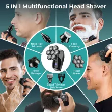 - 5-in-1 Multifunctional Grooming: Includes interchangeable heads for bald shaving, trimming hair, nose hair removal, facial cleansing, and skin massage.
