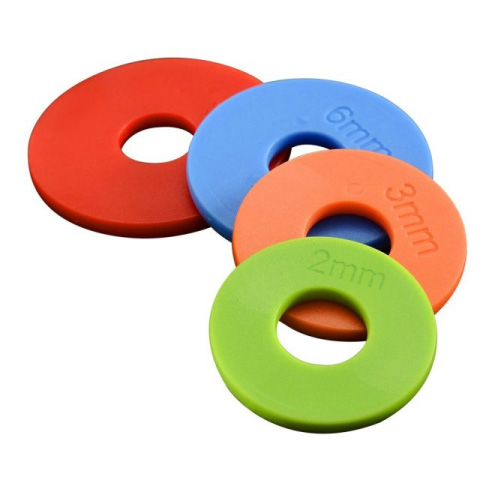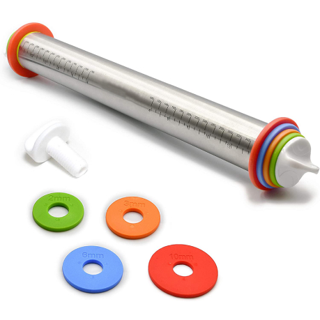 Roll dough for pies, cookies, pizzas, and more to exact proportions with the ultimate baking assistant. Our Adjustable Stainless-Steel Rolling Pin measures 17 inches long  and features four removable rings: 0.4, 0.23, 0.1, 0.08 in (10, 6, 3, 2 mm) so you can adjust your dough-rolling to a certain width and height.