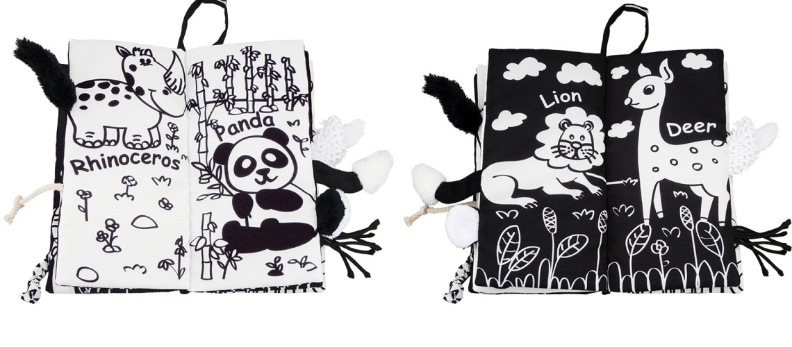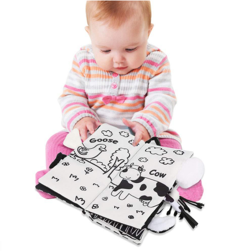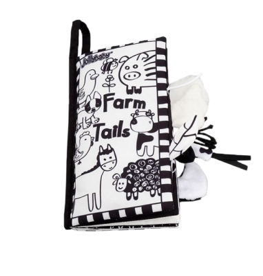 Let your baby physically feel and be attached to a fun story with this exquisite, unique storybook experience. Each page features recognizable animals with labels to allow your child to build his or her cognitive skills and animal recognition. The black-and-white nature of this storybook also aids in stimulating visual development.