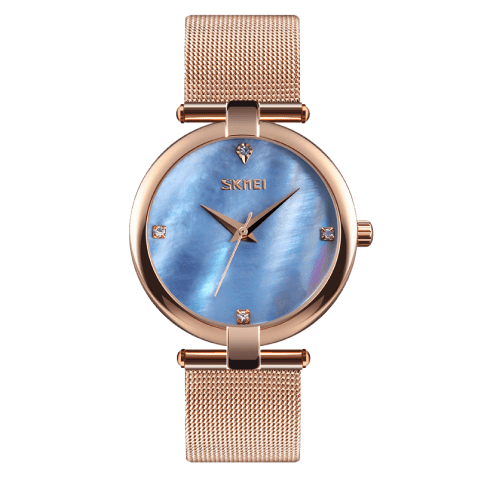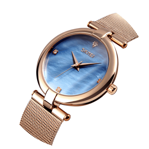 This watch is absolutely beautiful. First of all, the rose gold is subtly stunning and has an old world charm but the styling of the watch is fashion forward for today's look. I wear it on my left wrist and it compliments my wedding ring because the blue face of the watch pulls the two together. The watch is thin and not clunky - feels very feminine even though I have large hands for a 5'3'' height. Last, I was able to adjust the size in 5 minutes. No need to see a jeweler to achieve a perfect comfortable fit. I would definitely buy another watch here for their fine styling and accuracy of the timepiece.