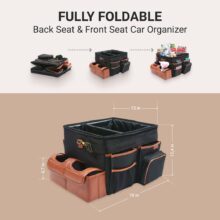 Large compartment with a removable divider, eight side pockets and two front pockets can hold everything you need on the road – from drinks to gadgets. It is suitable for all car models, and you can use it in your front seat, back seat, or even in the trunk. Plus, the lid works as a backseat table!