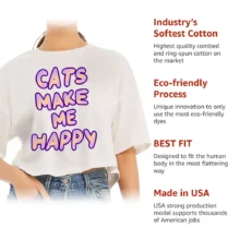 Cats Make Me Happy Women’s Crop Tee Shirt has a great look and cool fit. No matter what time of the year it is, you have a shirt for it all! This cropped t-shirt is the perfect way to make a statement. This t-shirt is made of soft cotton, which will not easily deform, and is breathable as well as comfortable, making you feel comfy all day.