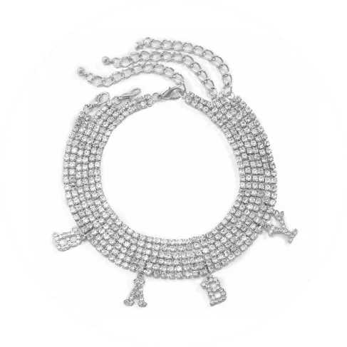 Main materials of the ankle bracelet: zinc alloy with crystals and rhinestone. Color: White K. Length: 8.6+1.9/8.6+1.9/8.6+1.9in. Weight: 0.9 in.