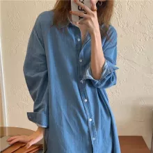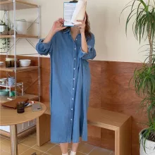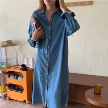 Made from a harmonious blend of cotton and polyester, this dress provides both the durability of denim and the comfort of soft fabric. Its full-length sleeves and mid-calf drop are ideal for those crisp spring days, offering just the right amount of coverage. A neat turn-down collar and a sleek, single-breasted closure add a touch of professionalism to your casual look. With its A-line silhouette, the dress accentuates your waistline, creating an empire effect that’s both slimming and stylish.