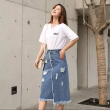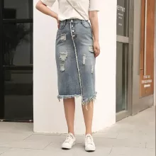 Chic Korean-Style Front Button Denim Skirt with Distressed Detail