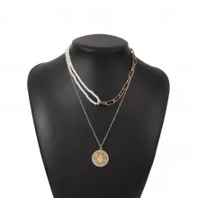 The necklace is multilayered. The first layer is composed of two types of chains: ball and cable. Its length is 15.74 + 2.36 in. The length of the necklace with a coin pendant is 19.68 in. The size of the coin is 0.98 in * 0.98 in. Weight: 0.7 oz. Material: zinc alloy.