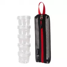 This portable spice kit includes five clear plastic bottles neatly organized in a durable mesh storage bag. Each bottle is designed for easy use and refill, making it simple to keep your essential seasonings fresh and ready to use. The mesh bag provides excellent ventilation and visibility, allowing you to quickly identify and access different spices.