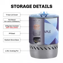 - Complete Cooking Set: Includes a portable net bag, lid, bowl, heat-exchanger pot, insulated pot cover, extra pot stand, and radiant gas stove.