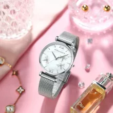 Featuring a high-quality Japan Quartz movement, this watch delivers exceptional precision, keeping you perfectly on time no matter where life takes you. The round, 36mm dial is crafted from oyster shell, giving it an iridescent glow that changes beautifully in the light. The folding clasp with safety ensures a secure fit, while the durable stainless steel band complements the elegant design. Water-resistant up to 3Bar and shock-resistant, this timepiece is ideal for daily wear without sacrificing style.