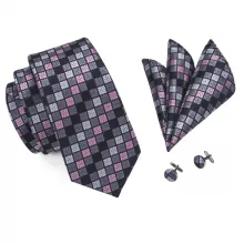 Introducing the stunning grey plaid novelty silk tie set, designed to bring sophistication to any occasion. This meticulously crafted necktie measures 59.06 inches in length and 3.35 inches in width, making it the perfect accessory for men who want to make a statement. Made from 100% jacquard woven silk, it promises both durability and luxury, allowing you to look sharp and feel confident at weddings, business meetings, or parties. This tie comes with matching cufflinks and a pocket square, ensuring you have a complete look without the hassle.