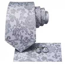 Designed to be worn during weddings, business meetings, or any formal event, this tie set is a must-have for every well-dressed man. The subtle floral design adds a touch of personality to your attire, while the silver-grey hue provides a sleek and polished look. The included cufflinks and pocket square complete the ensemble, ensuring you look sharp and put together.