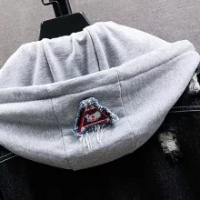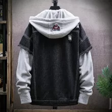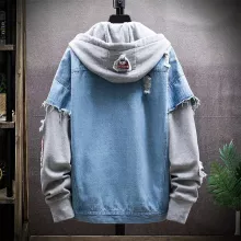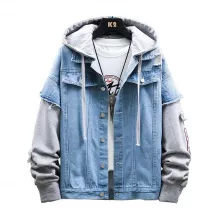 Our Men’s Hooded Denim Jacket stands out with its hip hop-inspired appliques, offering a personalized touch that makes each piece unique. The ingenious combination of denim and knit sleeves not only sets it apart in design but also in comfort, providing a snug fit that’s just right for the transitional weather of spring and autumn.
