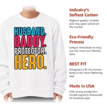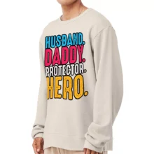 Husband Daddy Protector Hero Sponge Fleece Sweatshirt is made to be worn on repeat, season after season. The sleeves are semi-set-in at the shoulder and cuffed at the wrists. A relaxed waistband makes you feel comfortable all day long. Made from our sought-after, ultra-soft sponge fleece.