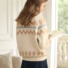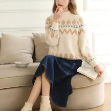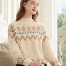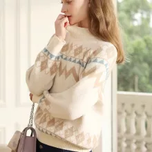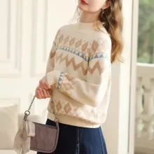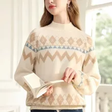 This loose-fitting sweater is versatile enough for everyday wear, whether you’re running errands or meeting friends for a coffee. Its geometric pattern adds a subtle touch of style, making it a great choice for pairing with jeans, leggings, or skirts. The medium-stretch fabric ensures a comfortable fit, while the full-length sleeves and mock neck provide added warmth and coverage. With its regular yarn thickness, this sweater offers a balanced blend of coziness without feeling bulky.