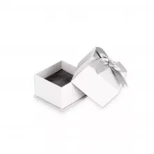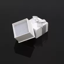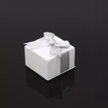 The box is of a delicate lily-white color. It’s wrapped in a pale-grey bow ribbon.