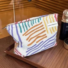 Introducing our latest addition to your travel essentials – a luxurious and fashionable Corduroy Cosmetic Bag. Designed for the modern woman who values both style and functionality, this bag is a must-have accessory for keeping your beauty products organized on-the-go. With its eye-catching striped design and high-quality corduroy material, this makeup pouch stands out in both elegance and durability.