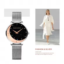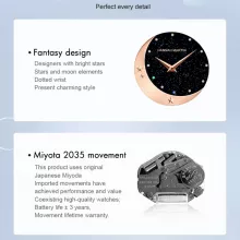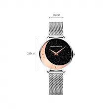 The watch features a durable stainless-steel strap that complements the shimmering dial, creating a perfect balance of beauty and strength. The folding clasp with a safety feature ensures the watch stays securely on your wrist while being easy to fasten and remove. Its shock-resistant and anti-magnetic features further enhance its durability, making this watch as practical as it is beautiful.