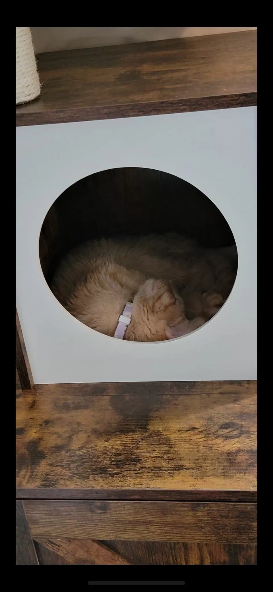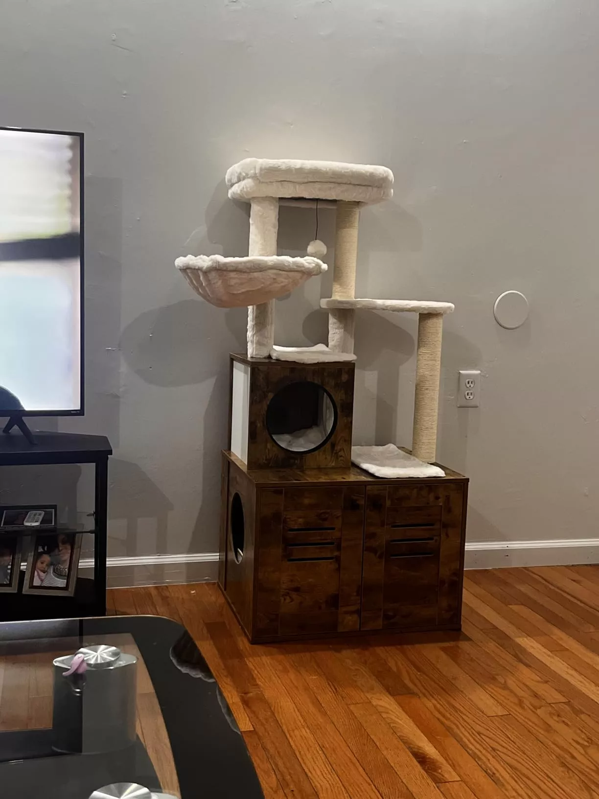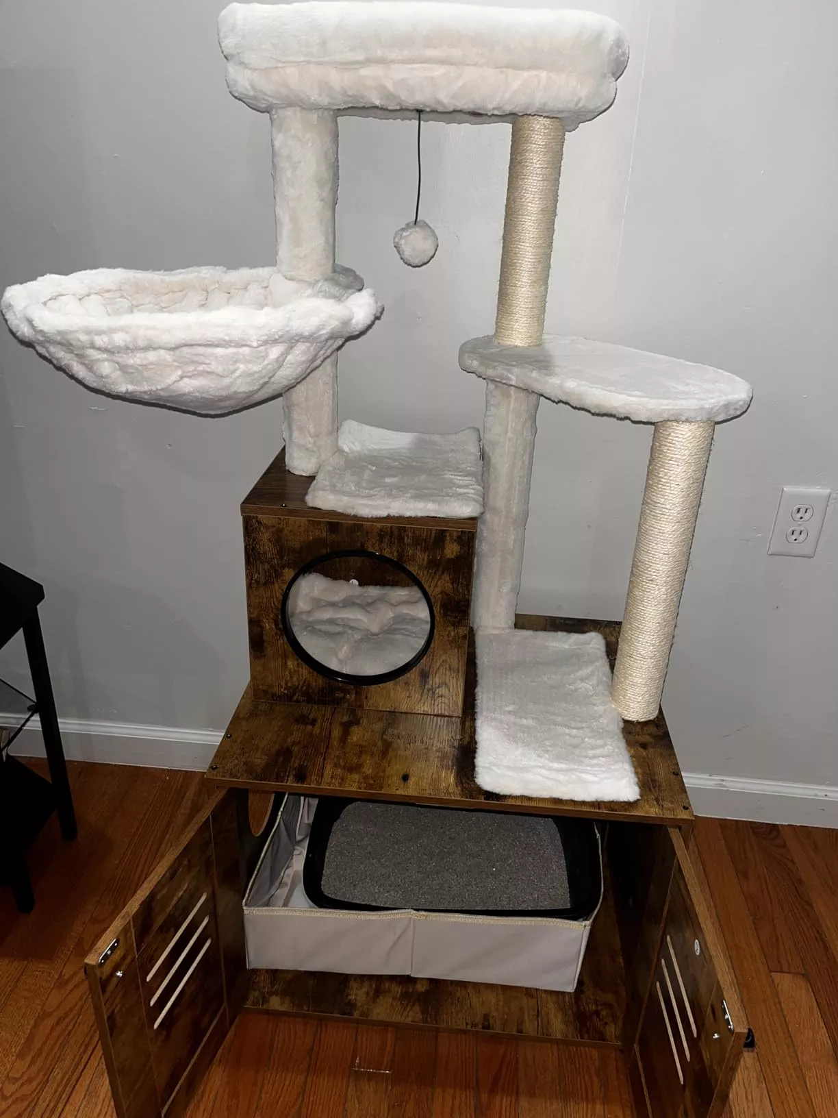 This cat tree is adorable! đđđ I'm picky about these things because a lot of them are just ugly, but I'd happily show this one off. The top part is a hit with my cats. Clearly made by someone who loves cats. The hidden litter box is genius. Just heads up, a regular litter box won't fit; you have to use the one it comes with. I added a wooden panel to make it sturdier.