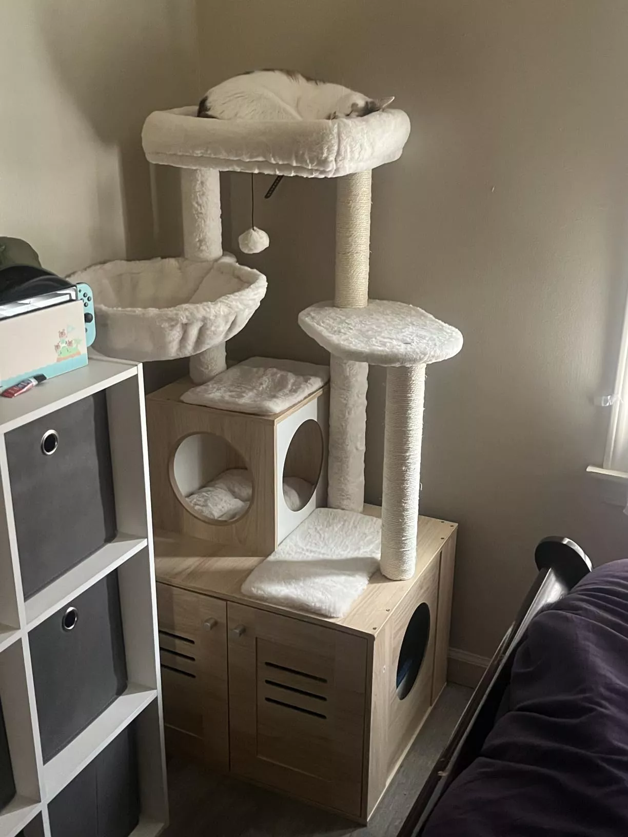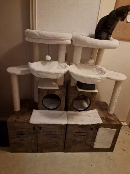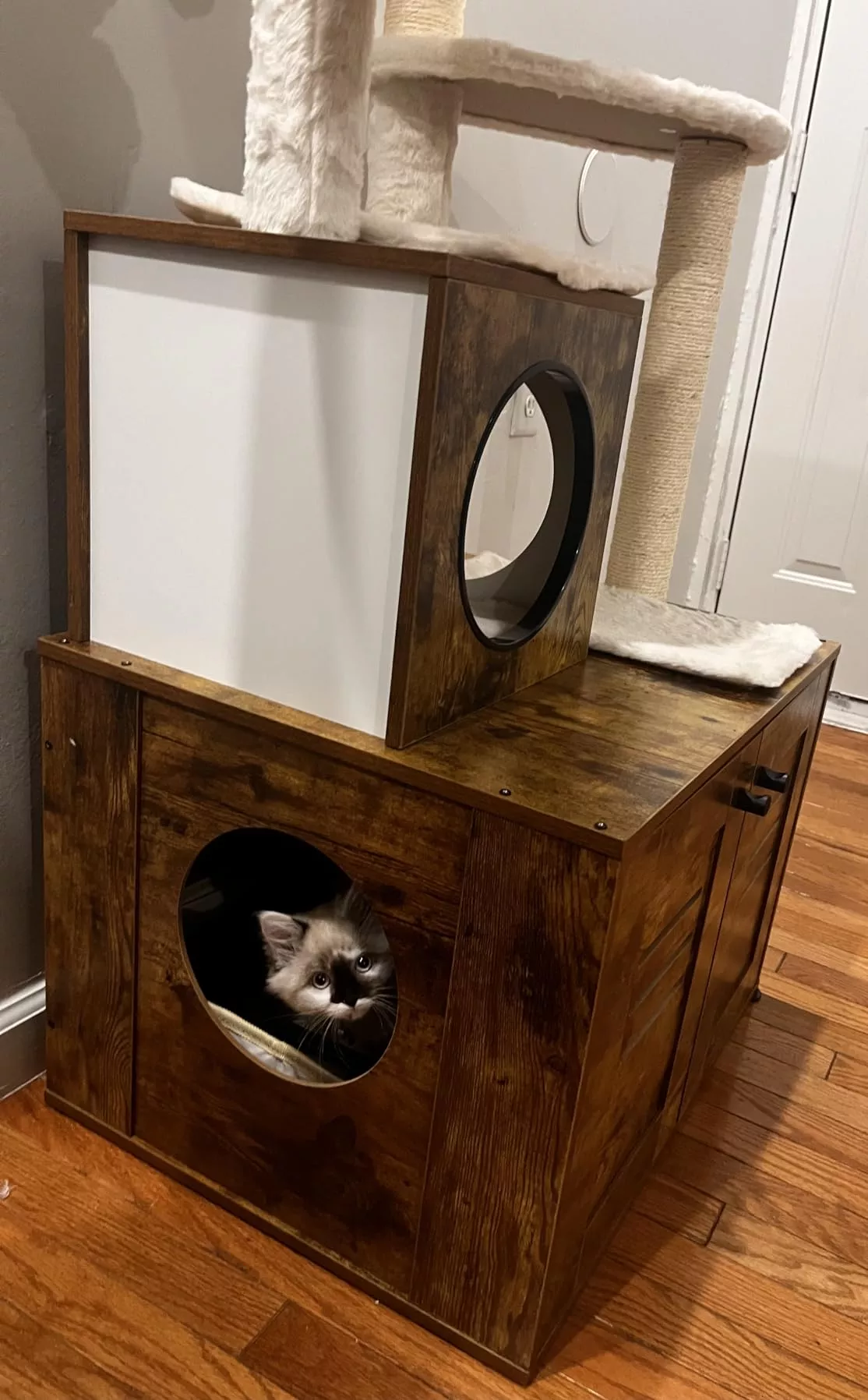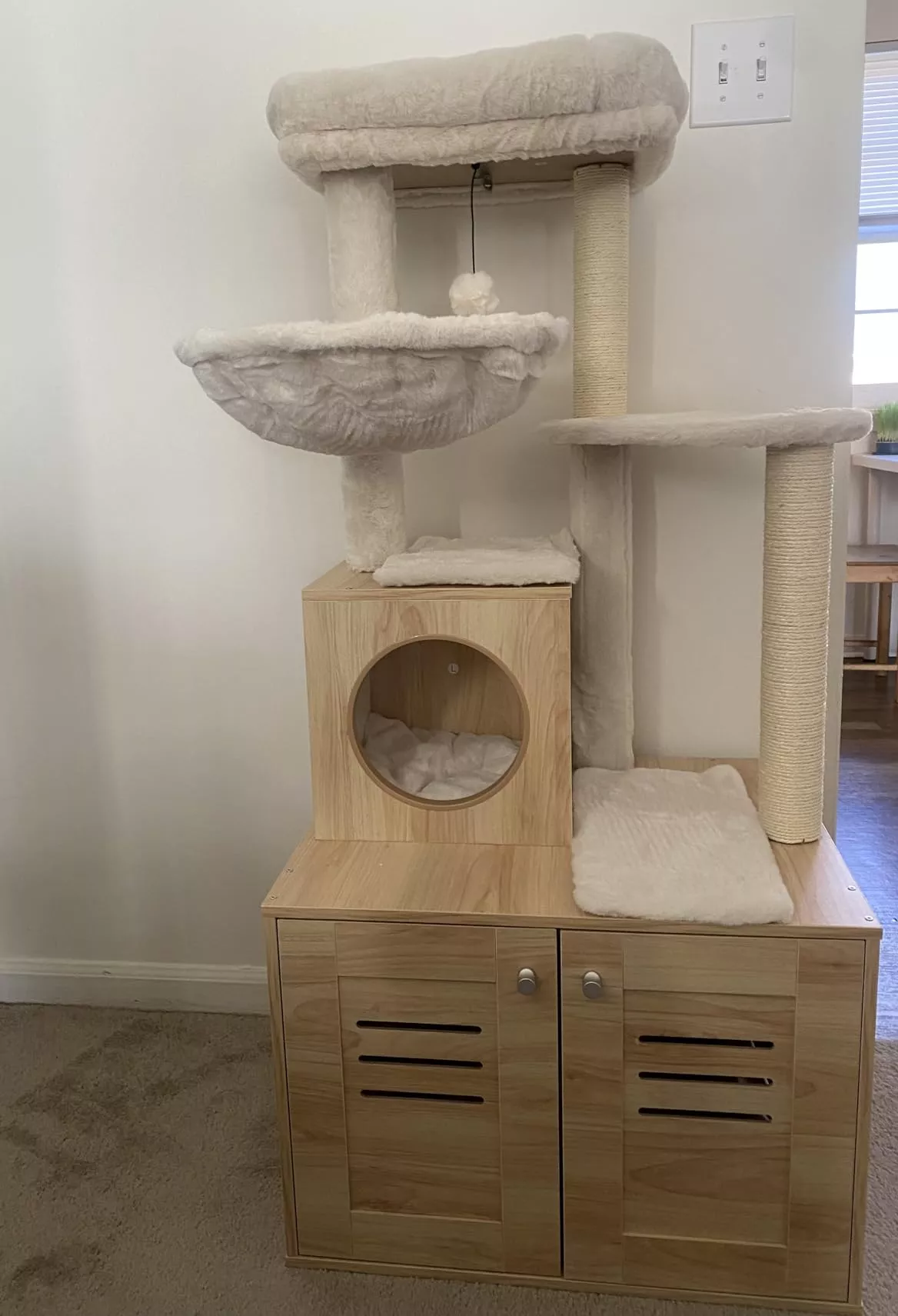 It's a cat tree with a bonus: a hidden spot for the litter box. Cats love lounging on it, and hiding the litter box is a game-changer. Big win for both me and the cats.