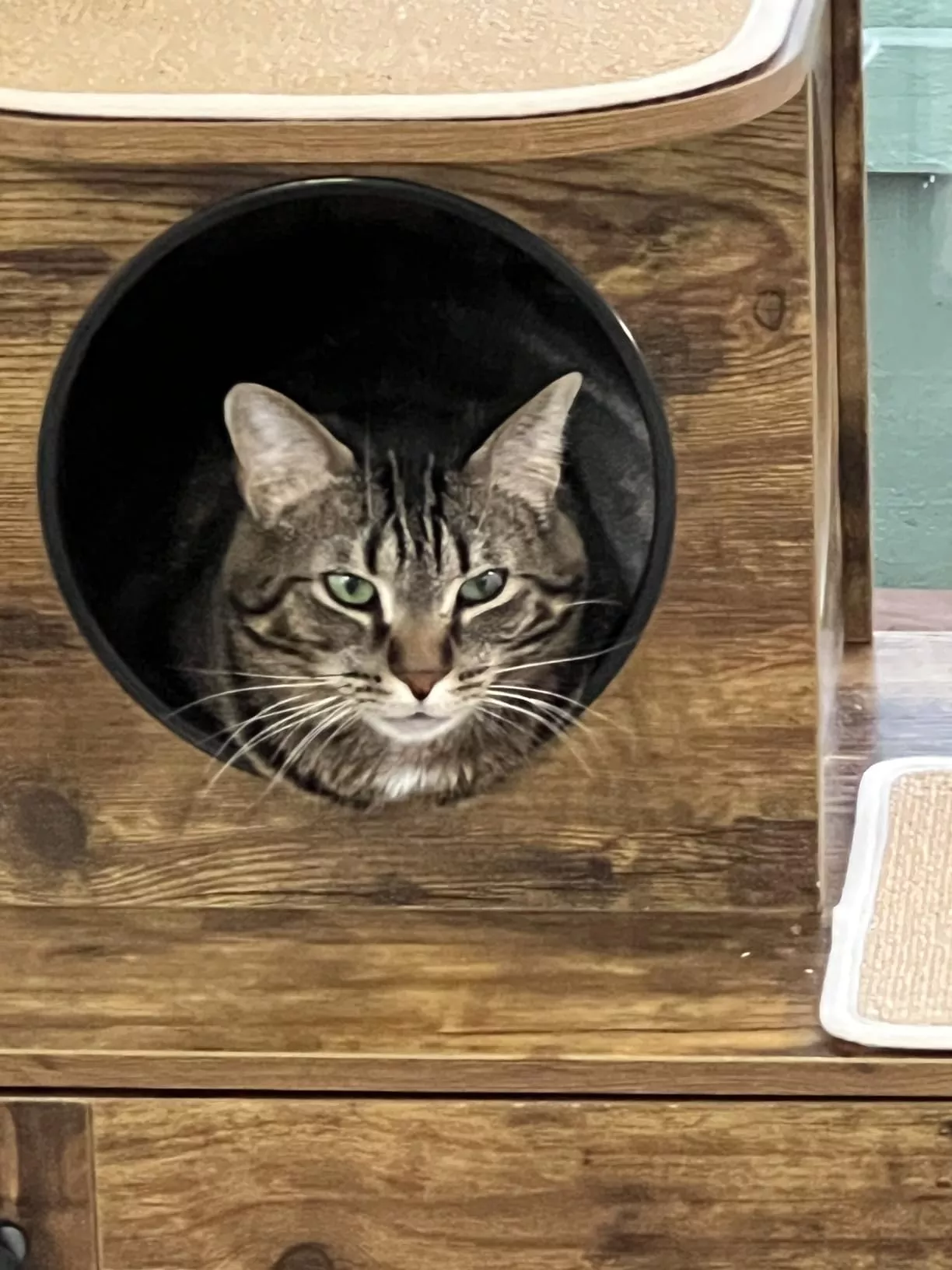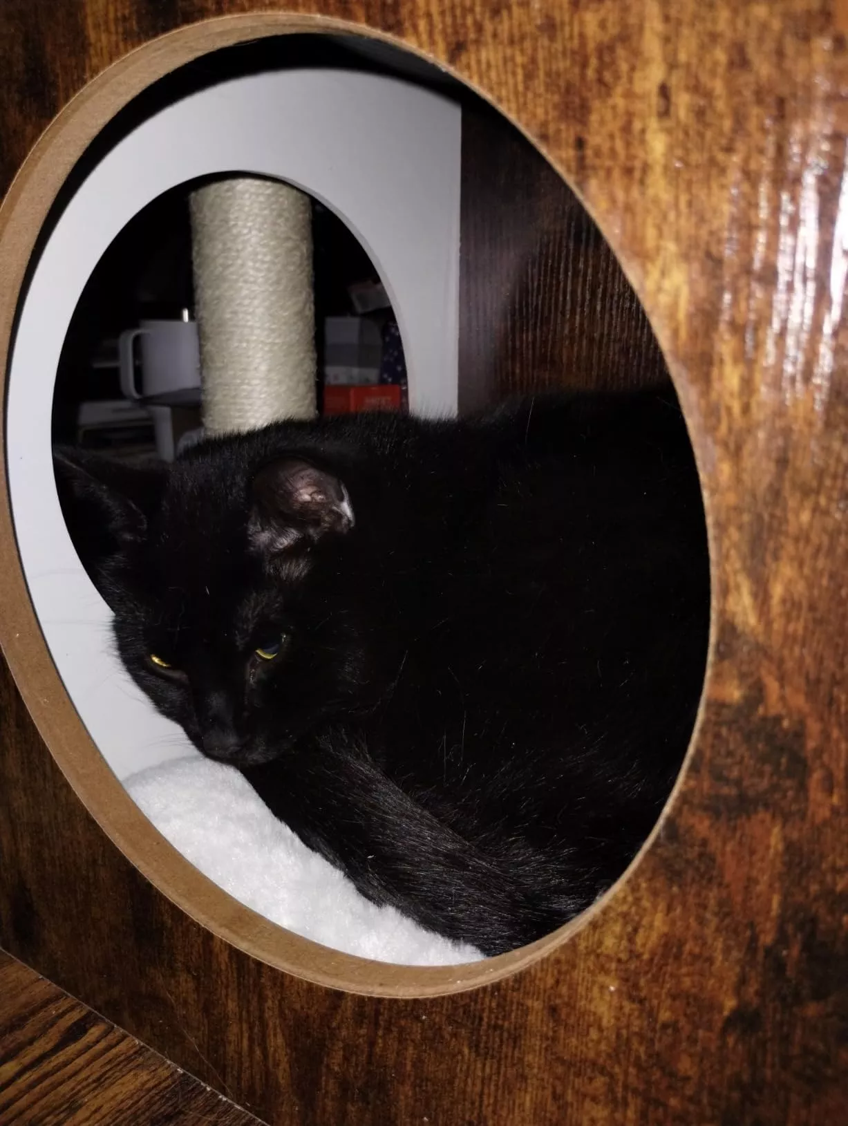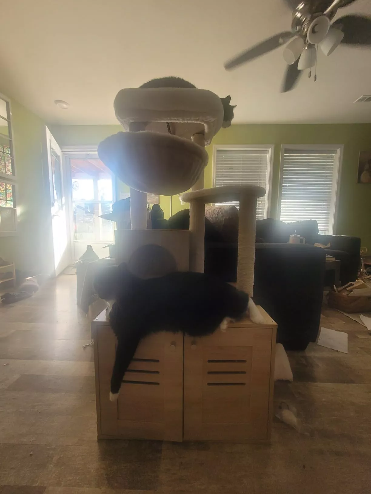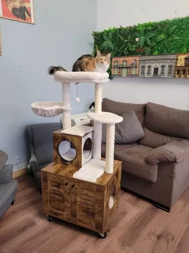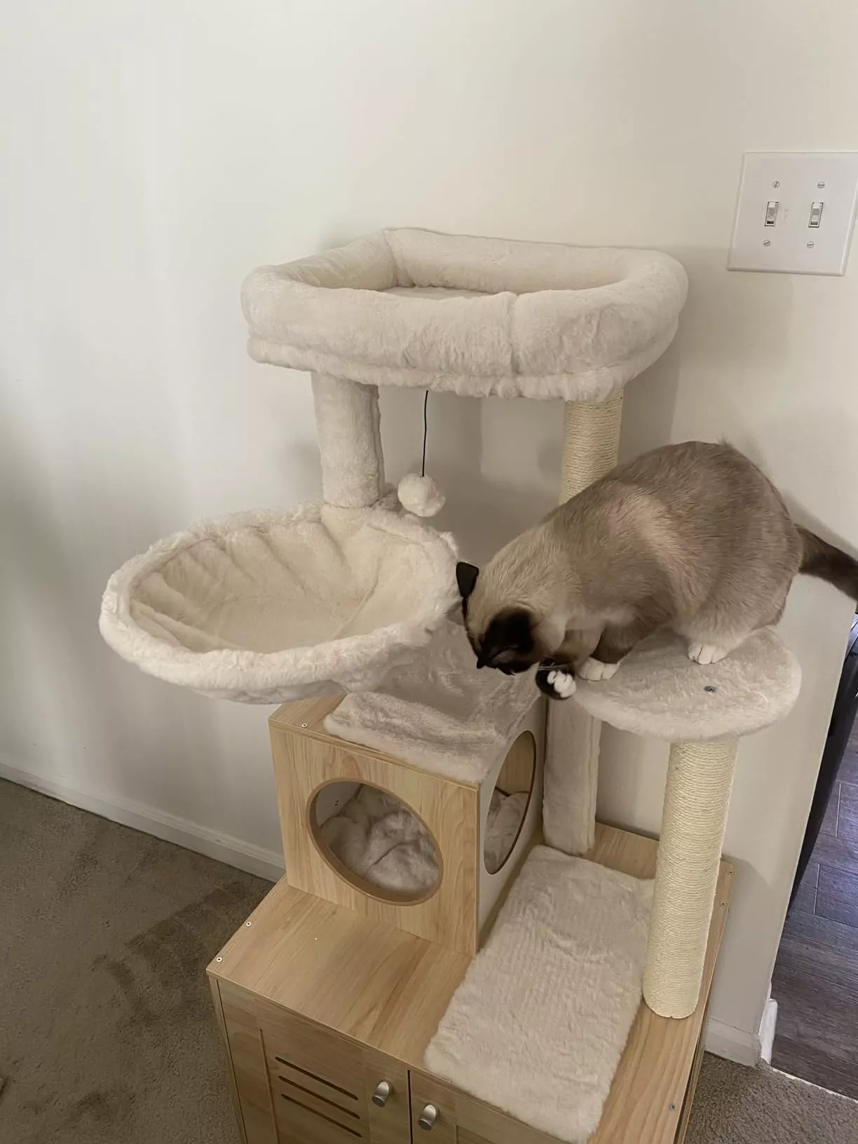 It's a cat tree with a bonus: a hidden spot for the litter box. Cats love lounging on it, and hiding the litter box is a game-changer. Big win for both me and the cats.