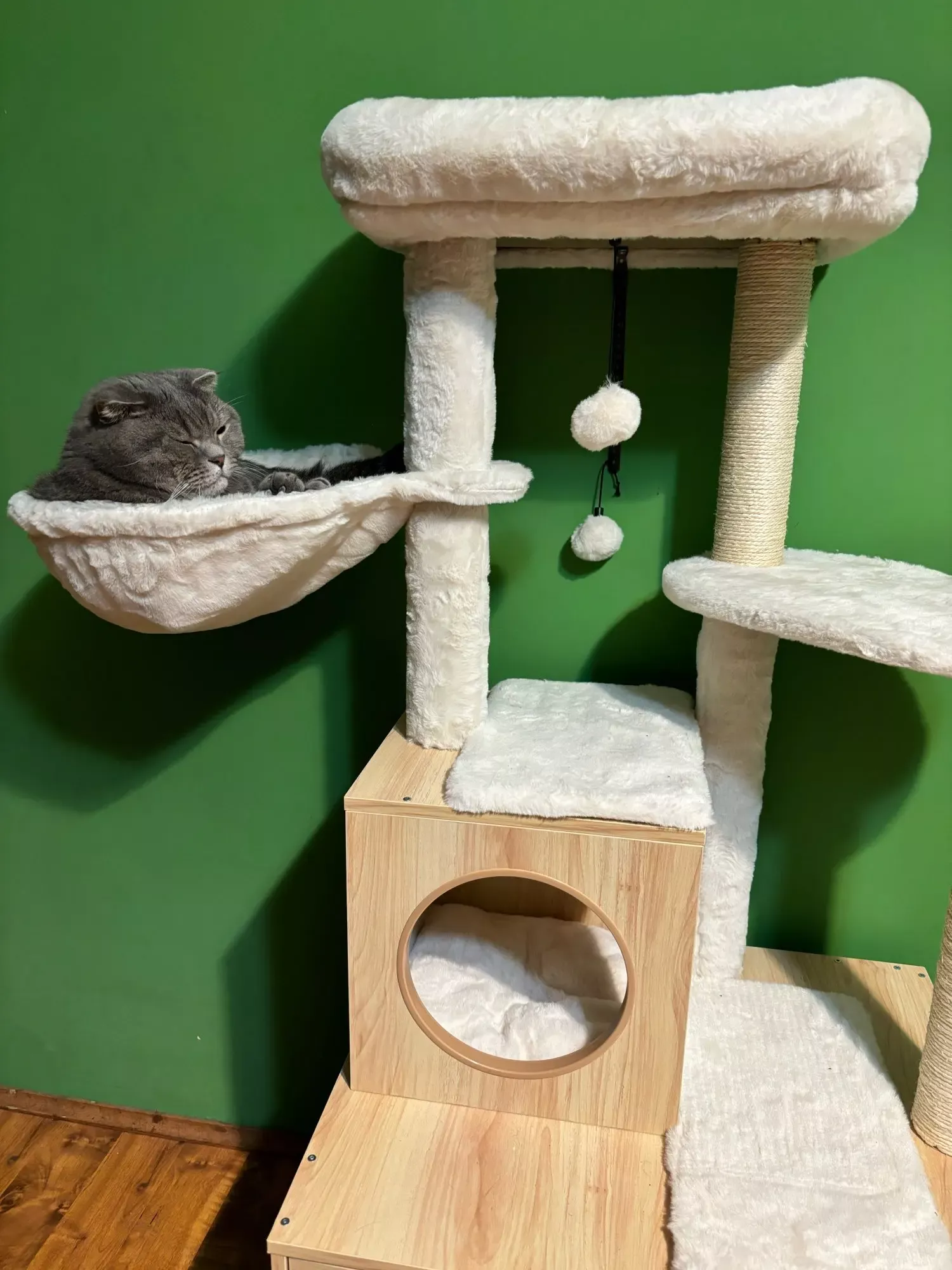 Building this for our cat was the best decision. It's really tall, stretching all the way up to the window so he can check out everything outside, which he loves. The half canopy top is his new favorite spot to lounge on. Plus, there's this wooden base and a shelf underneath that's perfect for hiding his toys â keeps our place looking neat. And if you've got a bigger cat, you can adjust the heights between sections to fit them better. Super happy with this! Also added wheels to move the tree around the house. Very convenient!