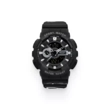 This is a men’s black sporty watch that fits your daily needs and outfits with multiple functions such as an alarm, a world timer, and day/date/month features.