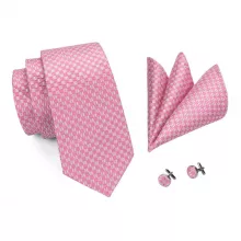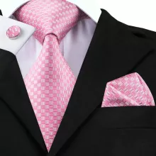 What makes this tie set special is its combination of luxurious silk material and fashionable plaid design. The pink and white color scheme adds a modern touch to traditional formalwear, making it an excellent choice for weddings or any occasion where you want to make an impression. The included pocket square and cufflinks ensure a complete, polished look, while the 100% silk fabric offers a high-quality feel that’s perfect for special events.