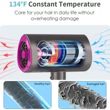 Our hair dryer is more than just powerful; it’s packed with advanced technology to protect and enhance your hair. The negative ion technology works by emitting ions that form a protective layer around each strand, reducing frizz, preventing heat damage, and locking in moisture for healthier-looking, shinier hair. The constant temperature protection ensures that your hair stays safe from excessive heat, so you can say goodbye to breakage and split ends.