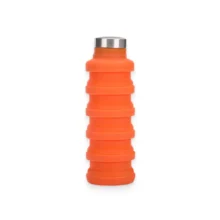 This foldable water bottle comes in a stylish orange color. Size when folded: 5.5” in height, with a 2.8” diameter. Full size: 9.5” in height. Main materials: food-grade silicone, BPA free, food grade PP. Cold and heat resistant.