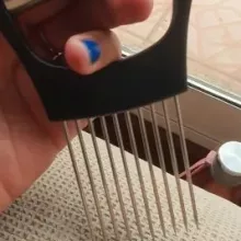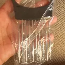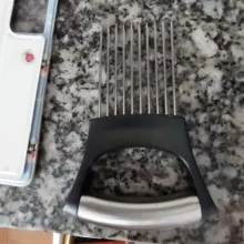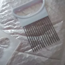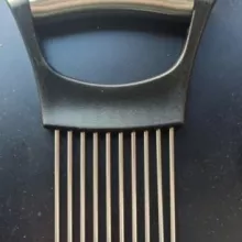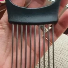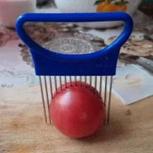 This holder is designed for heavy-duty use, and its larger needles make it sturdier than many others on the market. I've become so accustomed to using it that I use it all the time, not only for slicing onions but also for other vegetables. Additionally, the way it's designed keeps your fingers away from the knife blade, adding an extra layer of safety.