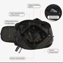 • Spacious and Lightweight: 19.5L capacity with a smart partition design, including a separate shoe compartment.