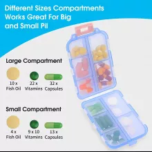 Our travel pill organizer features 10 separate compartments, providing ample space for all your medication needs. The box includes compartments in two different sizes, making it easy to store various quantities of pills. Whether you need to carry small pills or larger supplements like fish oil, this organizer has got you covered. Each compartment’s secure lid ensures your pills stay in place and remain fresh.