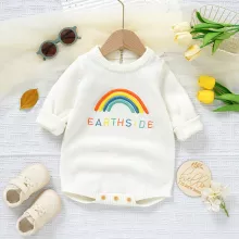 Made from soft acrylic fabric, this romper is gentle on your baby’s sensitive skin and provides the right amount of warmth for cooler weather. The charming cartoon rainbow design adds a cheerful touch, making it as fun as it is functional. With a simple O-neck collar and snap closures for easy dressing, this outfit is a convenient and stylish choice for everyday wear or special outings.
