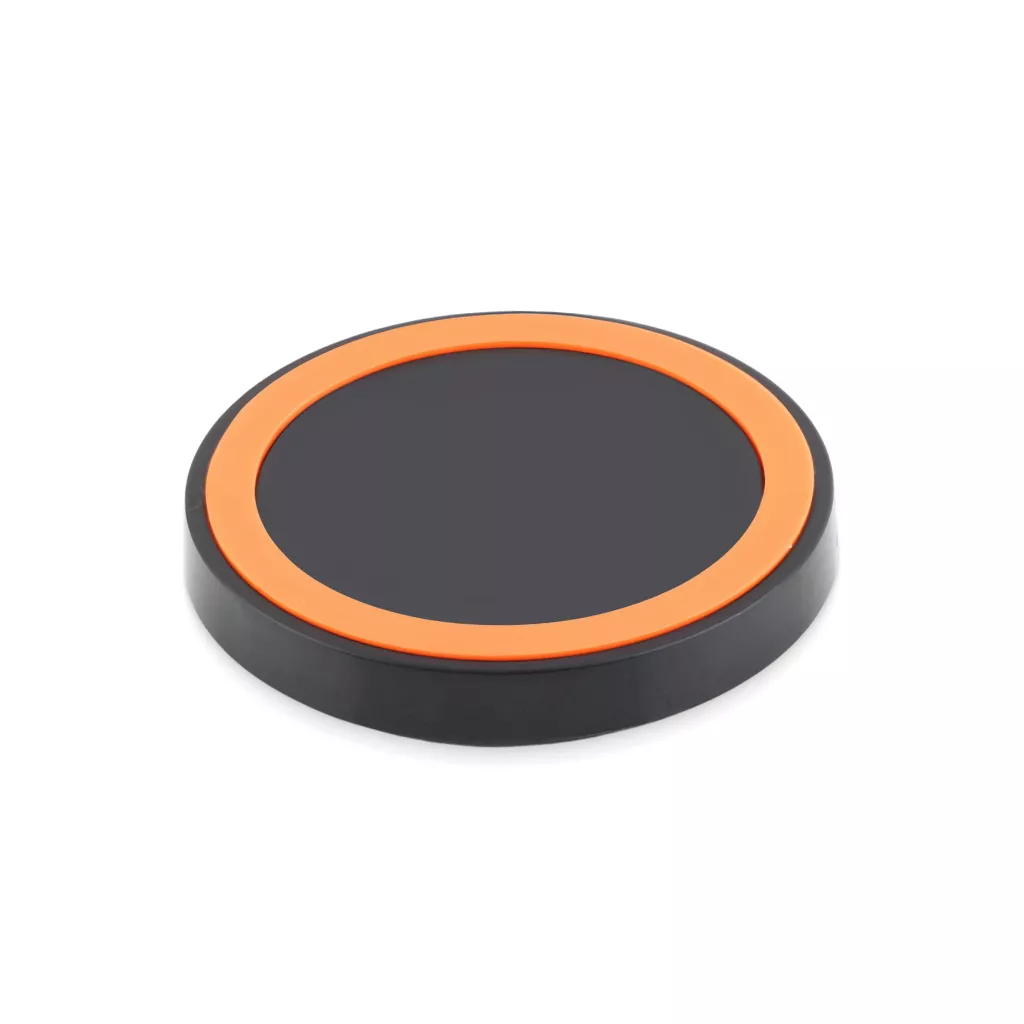 This charger is so petite: 2.75 inches wide and super thin – perfect for any desk. The orange rim is supposed to make it stand out and be noticeable. The indicator glows blue when charging is in progress, red when it’s not.