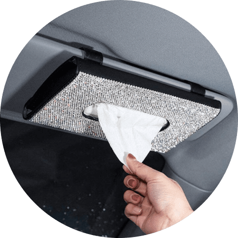 I purchased this to access my tissues easily while I’m driving and also dress up my pretty new Toyota SE sport edition! I Iove it! It’s even prettier in person. Super sparkly. Adjustable and easy to install. Very convenient. Easy to fill and holds a good amount of tissue! Terrific price!